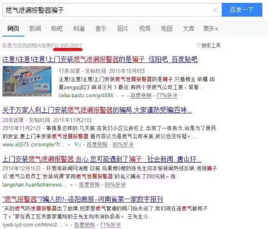 用百度搜索关键词“燃气泄漏报警器骗子”,真是吓了一大跳,2490000条,怎么成了骗子们的神器!